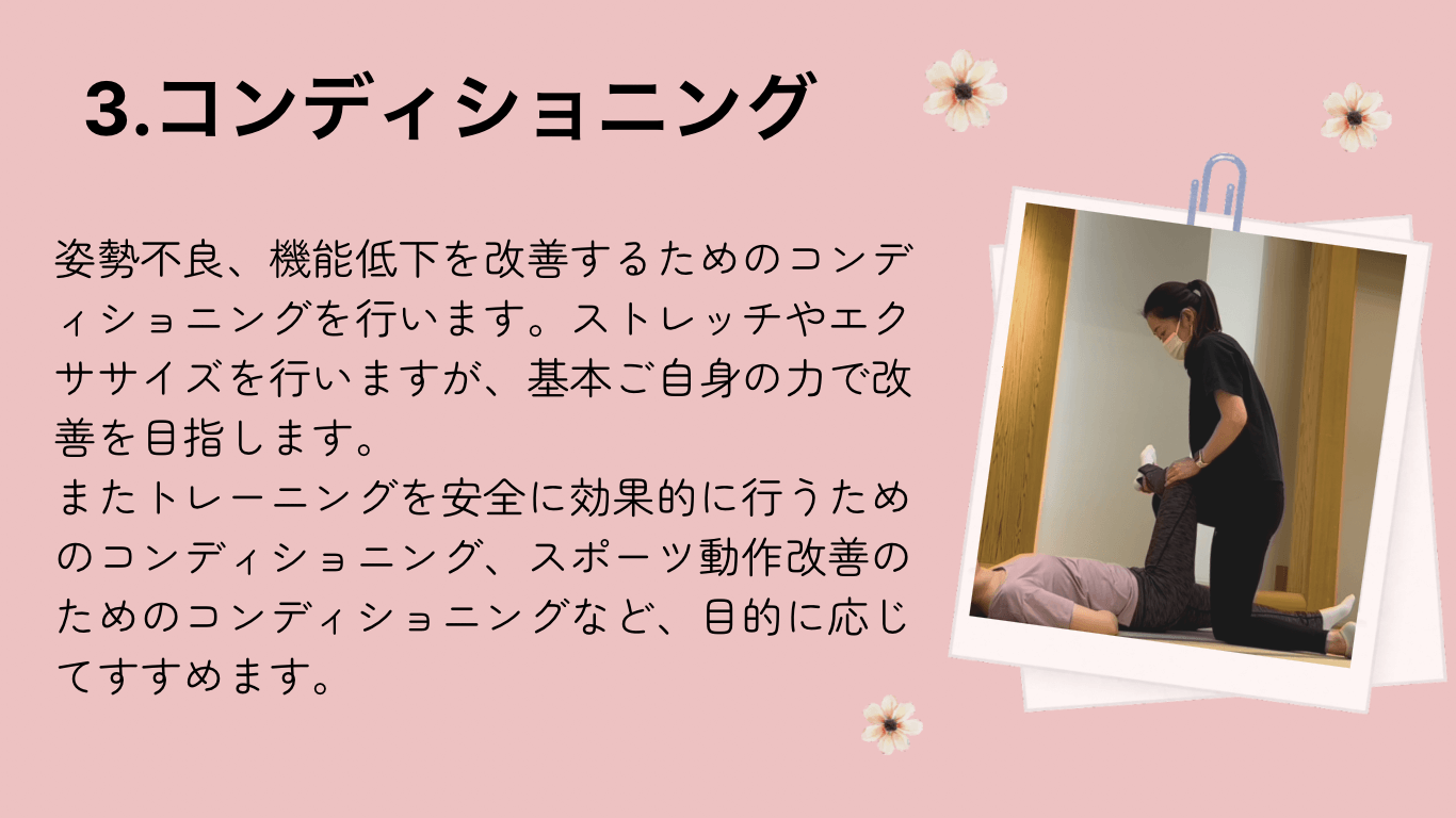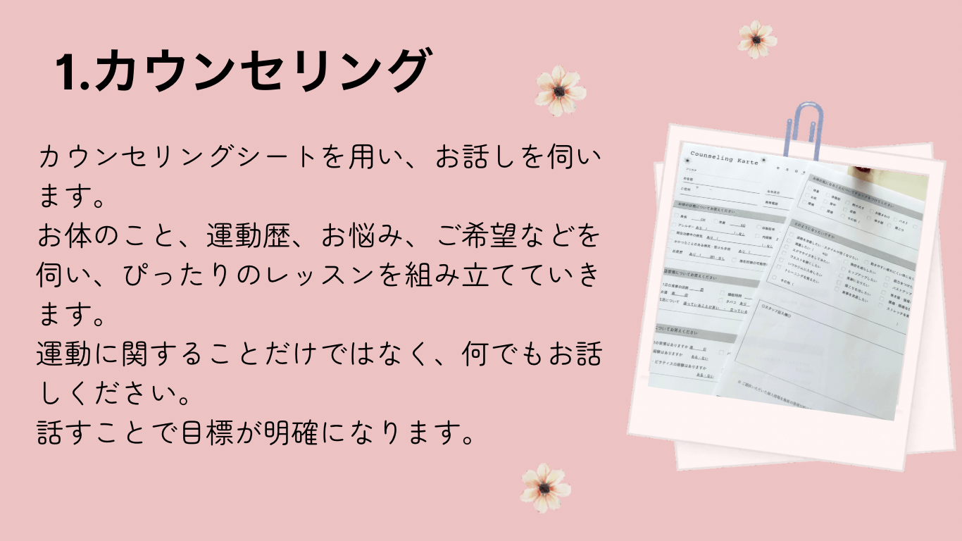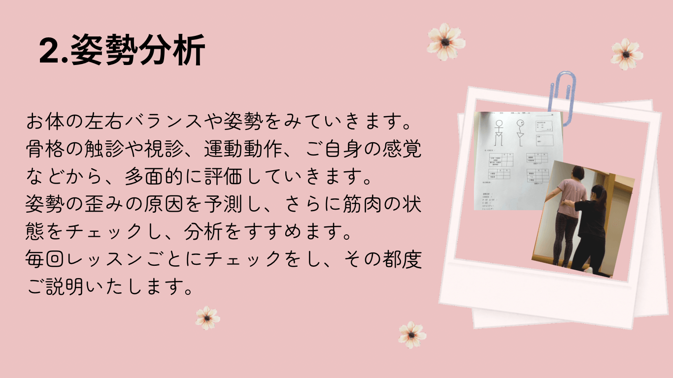 私のレッスンは「姿勢分析」と「コンディショニング」を取り入れているのが特徴です。姿勢分析により、お体のバランス、歪みなどを評価し、コンディショニングで姿勢改善、機能改善を行いながらレッスンを進めます。