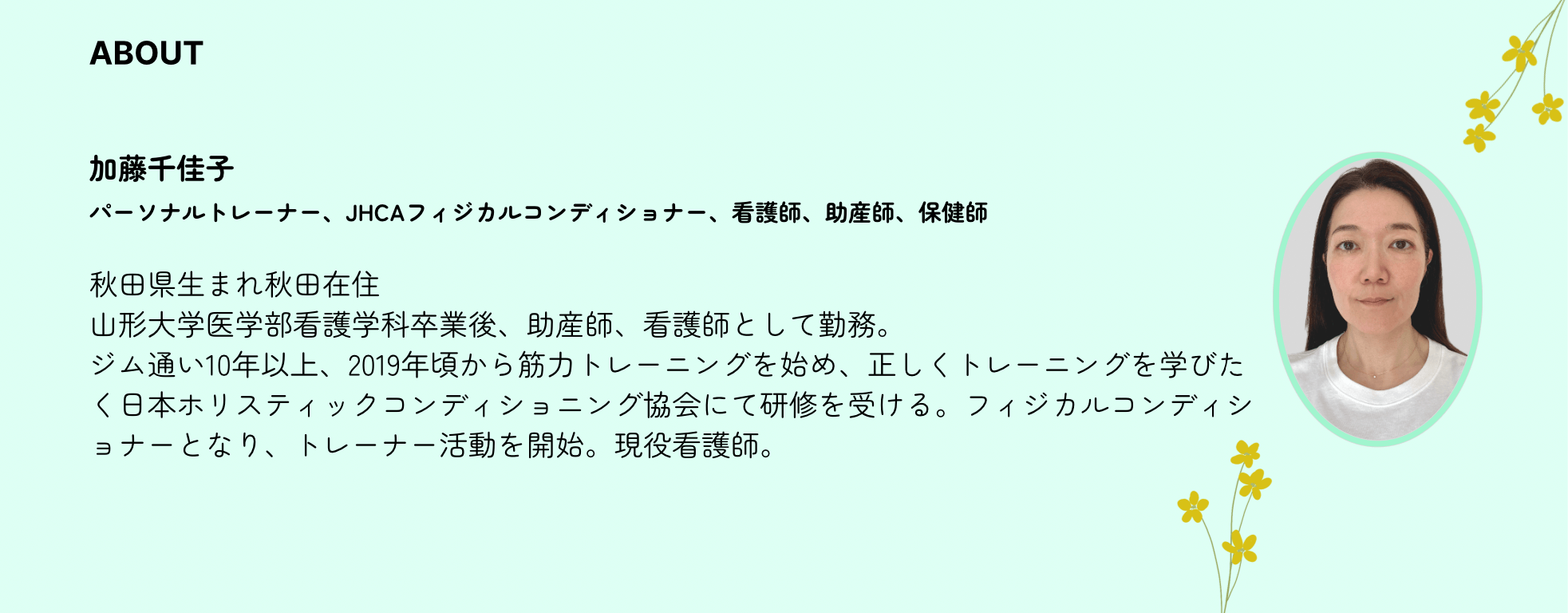 皆様こんにちは。秋田で活動しています、パーソナルトレーナー・フィジカルコンディショナーの加藤千佳子です。