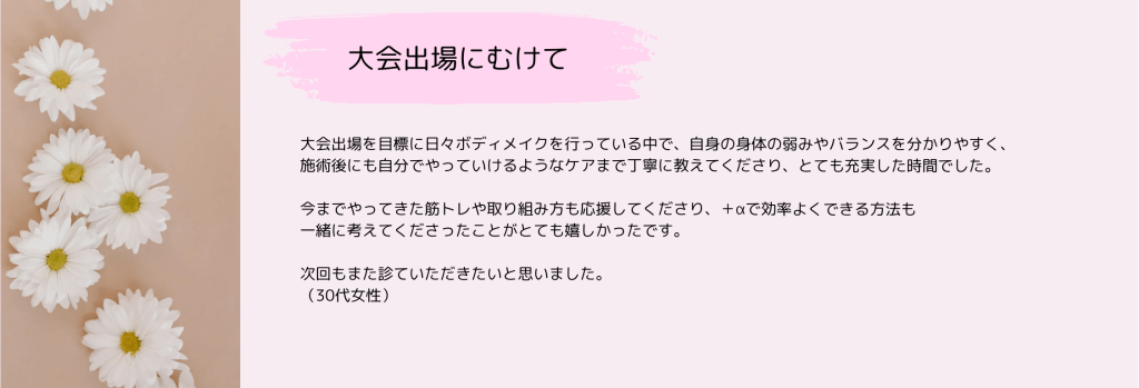 お一人お一人のお体の特徴を捉え、ご希望に沿いながら、丁寧に進めてまいります。